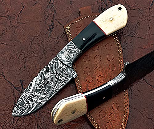9" Long Spear Point Blade Skinning Knife, Hand Forged Fire Pattern Damascus Steel Full Tang Blade, Camel Bone and Bull Horn Scale with Damascus Bolster, Cow Leather Sheath