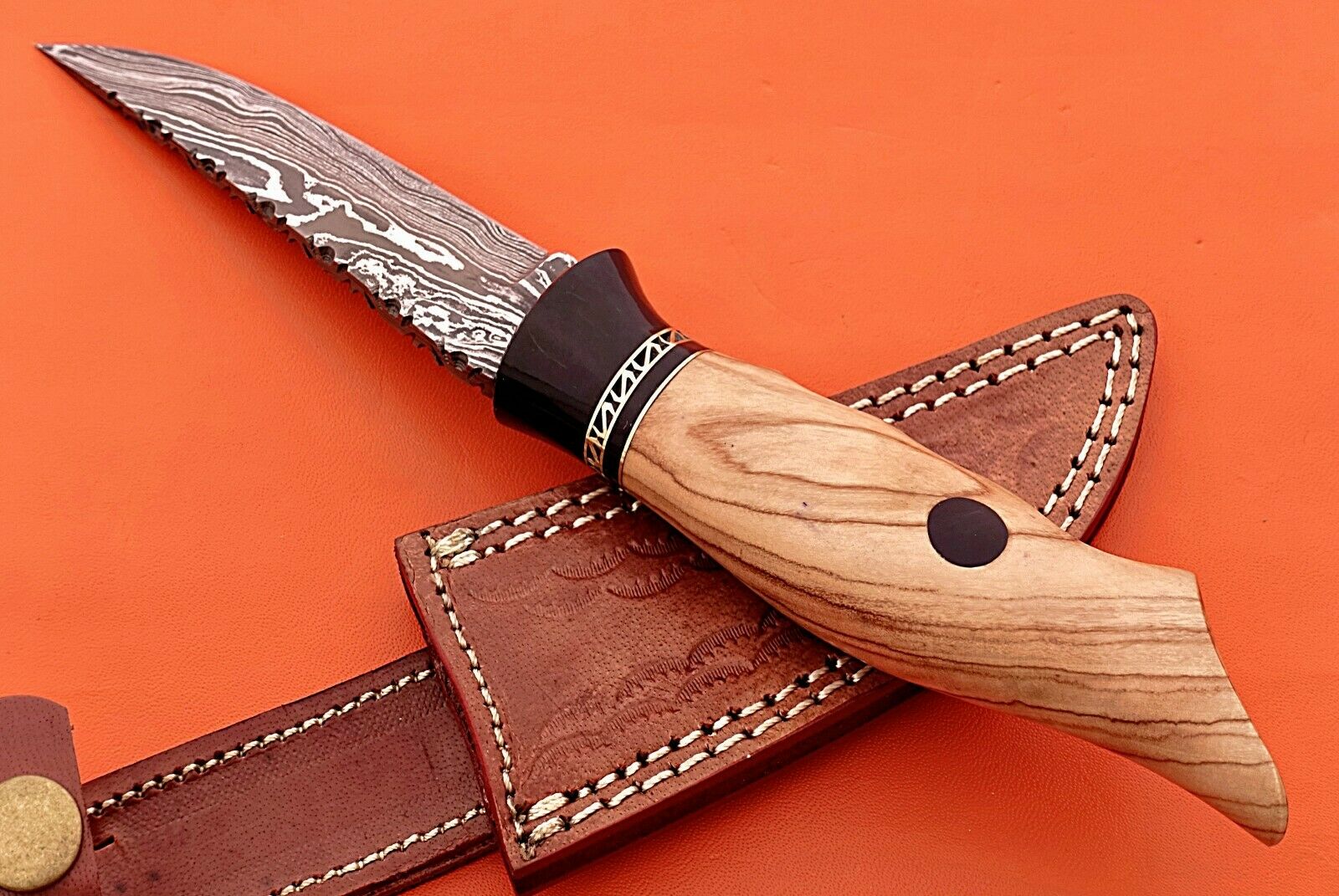 9" long straight back Damascus steel blade, Hand crafted round finger serrated scale skinning knife, Include Leather sheath