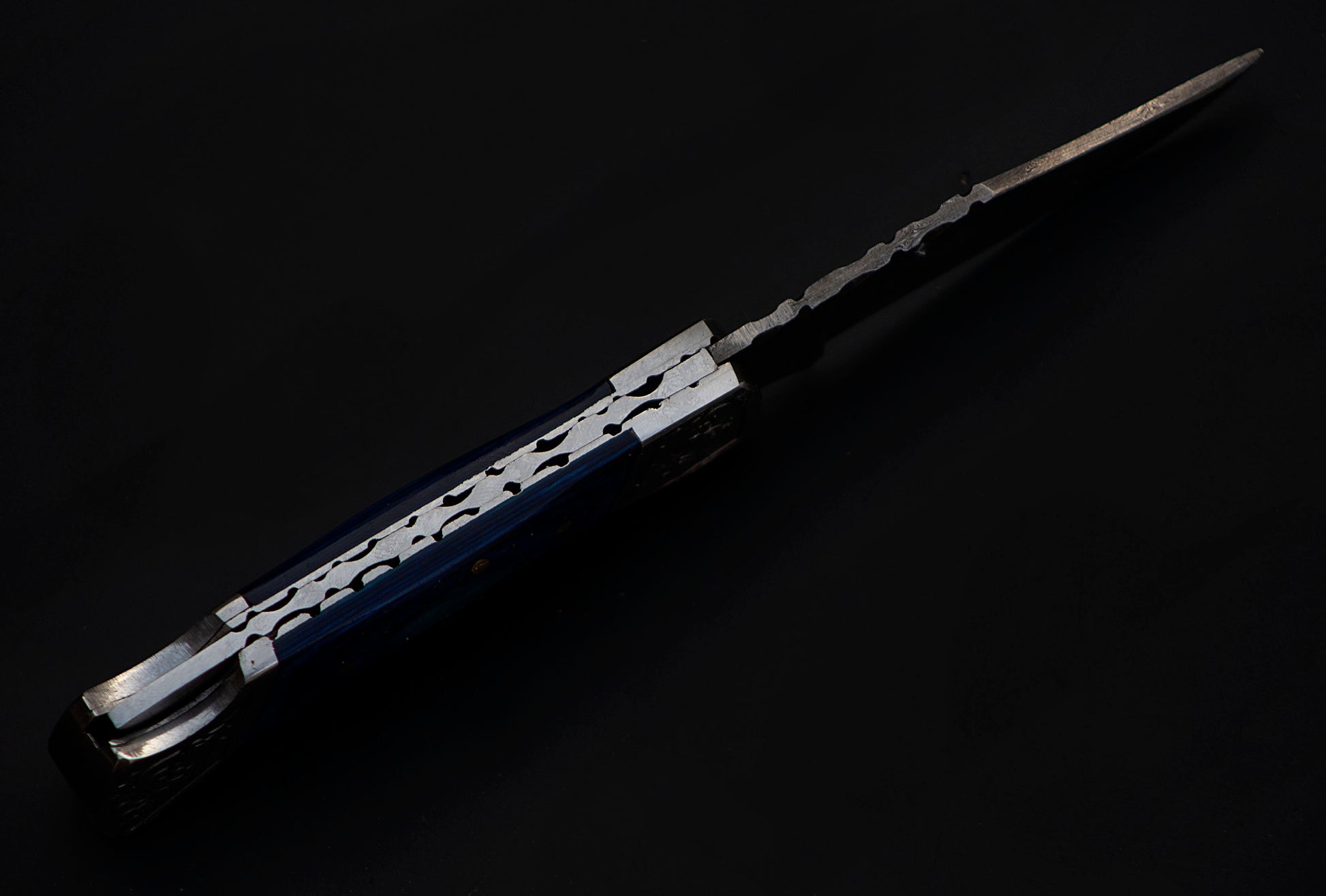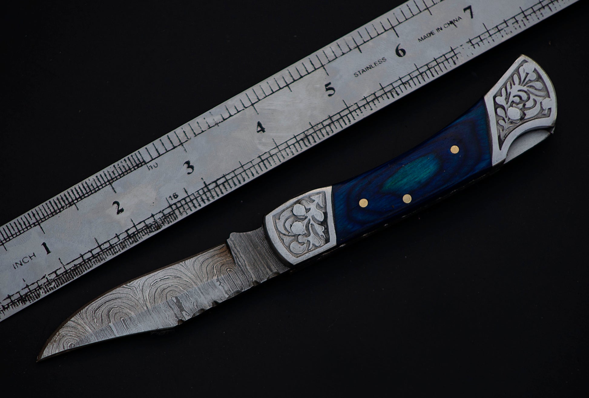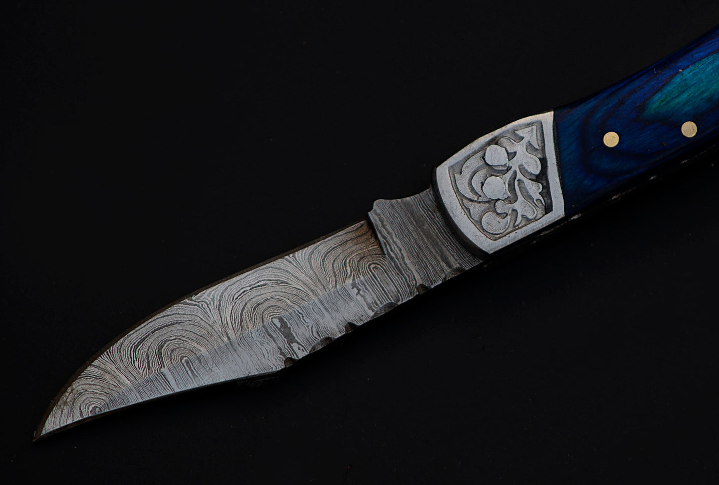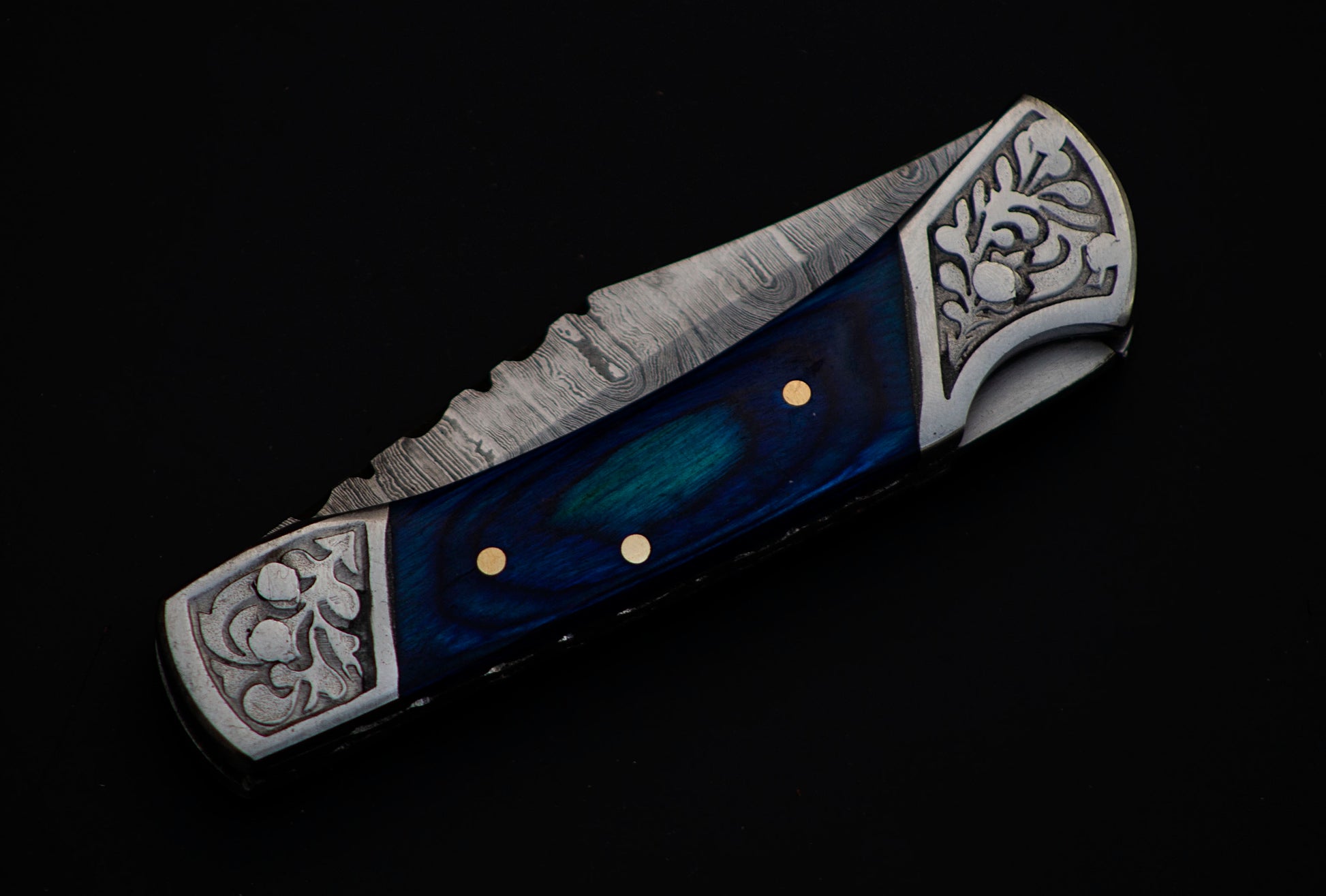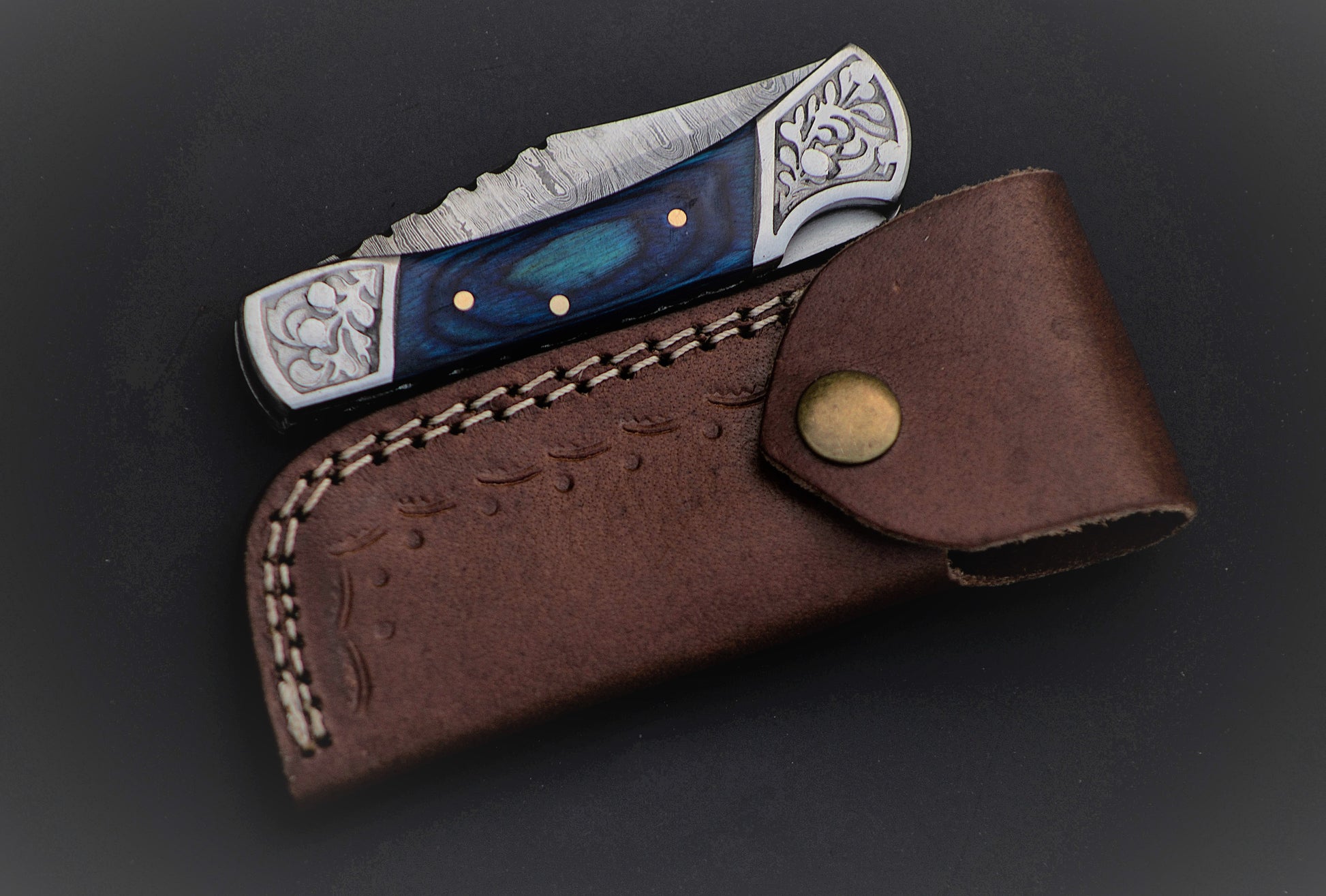 7" long back lock Folding Knife, Blue wood Scale with Engraved steel bolster, custom made 3.25" Hand Forged Damascus steel blade, Cow hide leather sheath with belt loop