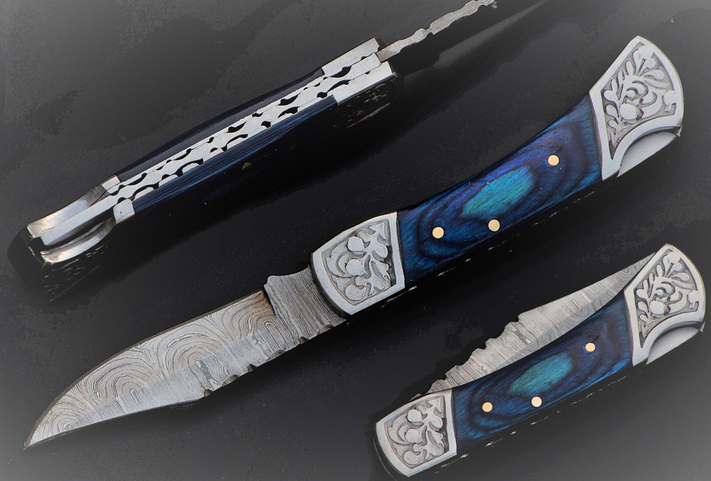 - Blue wood Scale with Engraved steel bolster, Rigid look Hand engraved Steel bolster.