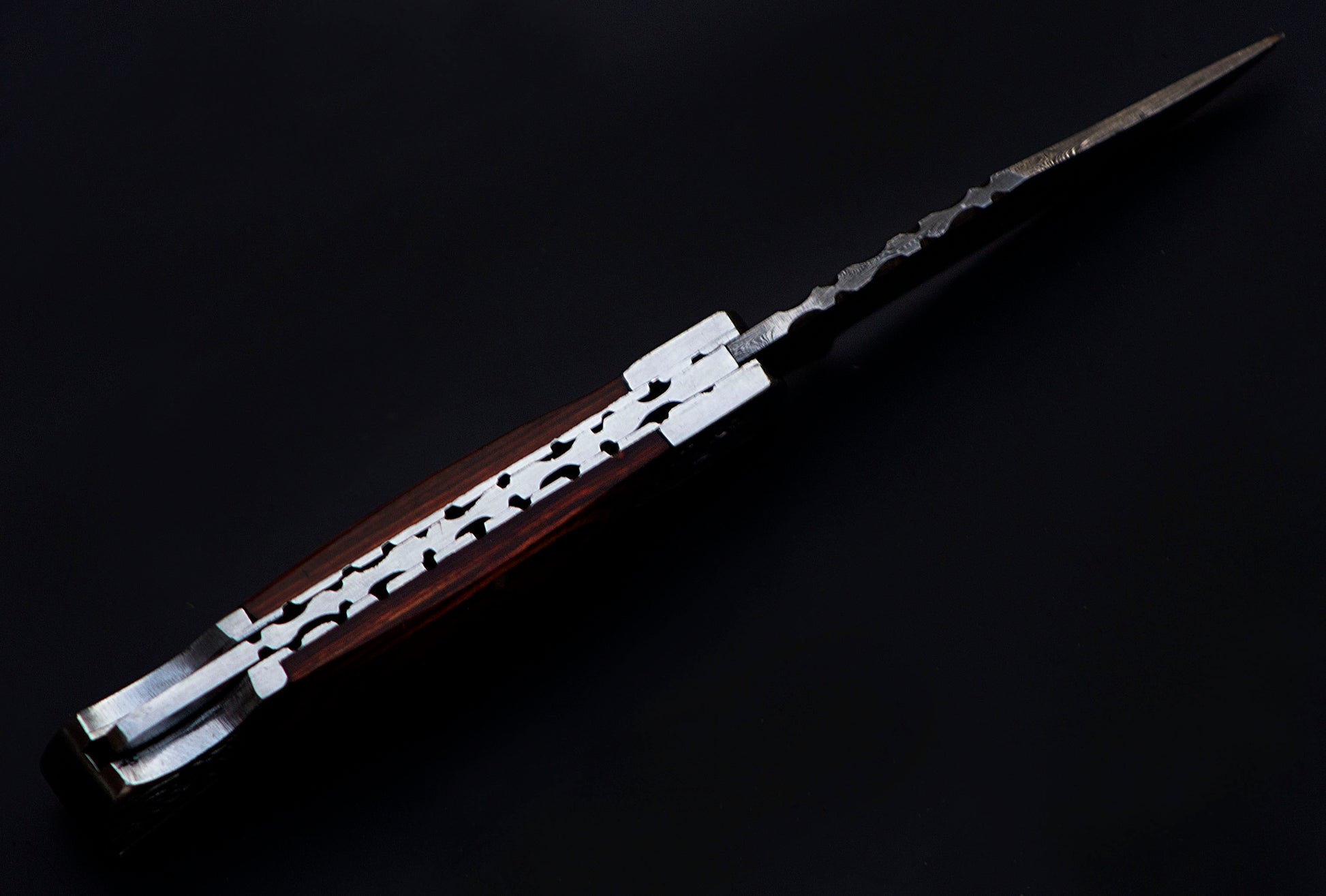 - Rose wood Scale with Engraved steel bolster, Rigid look Hand engraved Steel bolster.
