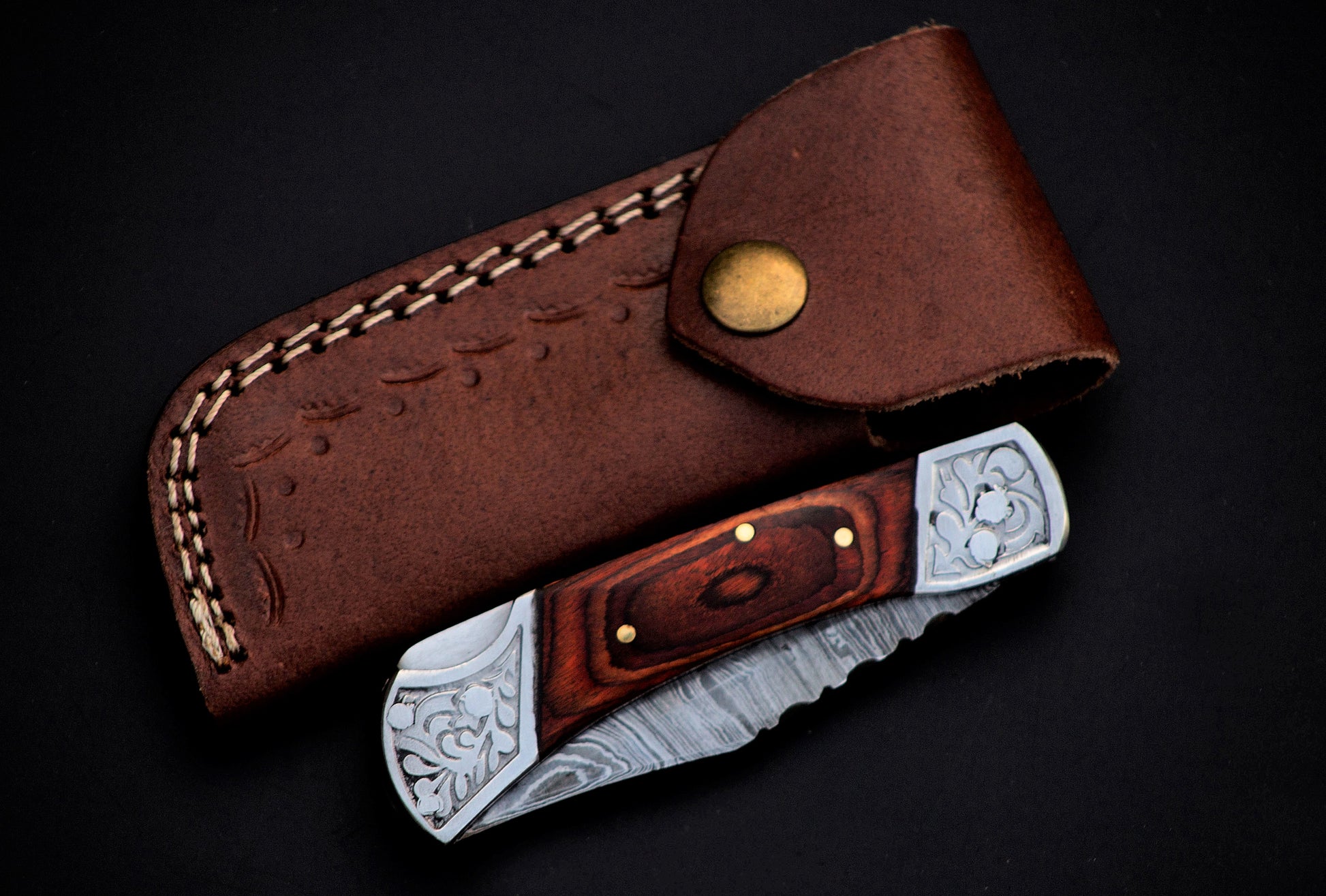 7" long back lock Folding Knife, Rose wood Scale with Engraved steel bolster, custom made 3.25" Hand Forged Damascus steel blade, Cow hide leather sheath with belt loop