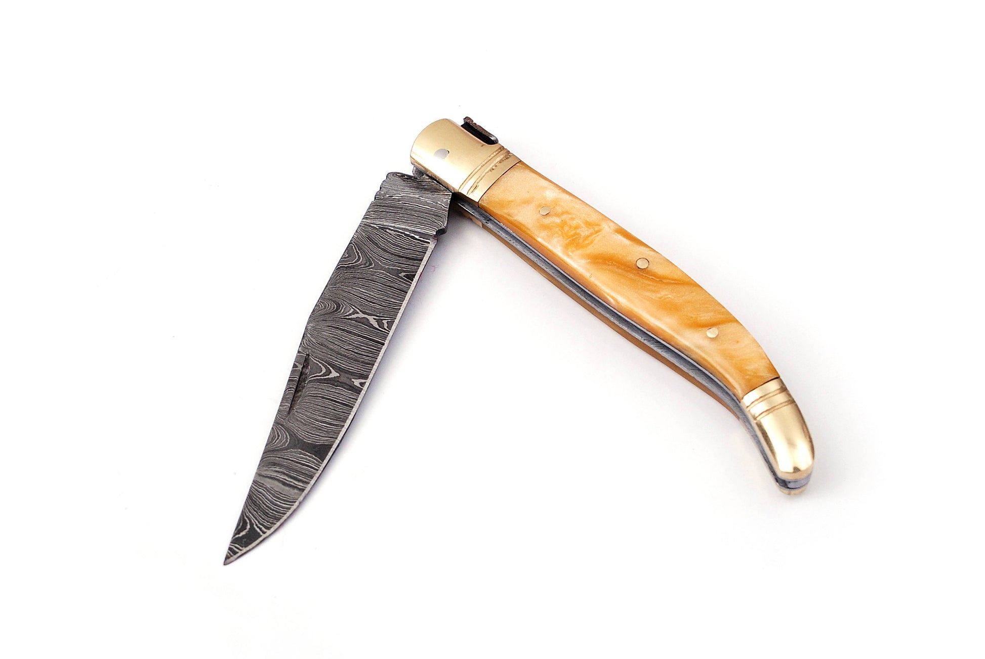 Copy of Laguiole Folding Damascus steel knife, 8.5" Long with 4" hand forged custom twist pattern Blade. Beige color unshrinkable Raisen scale with brass bolster, Cow hide leather sheath included