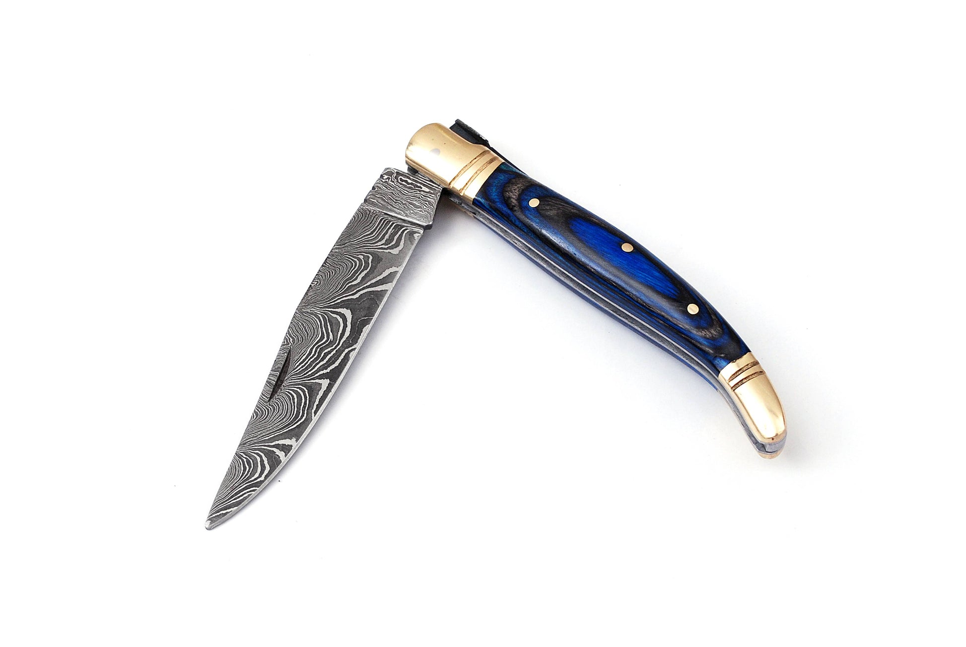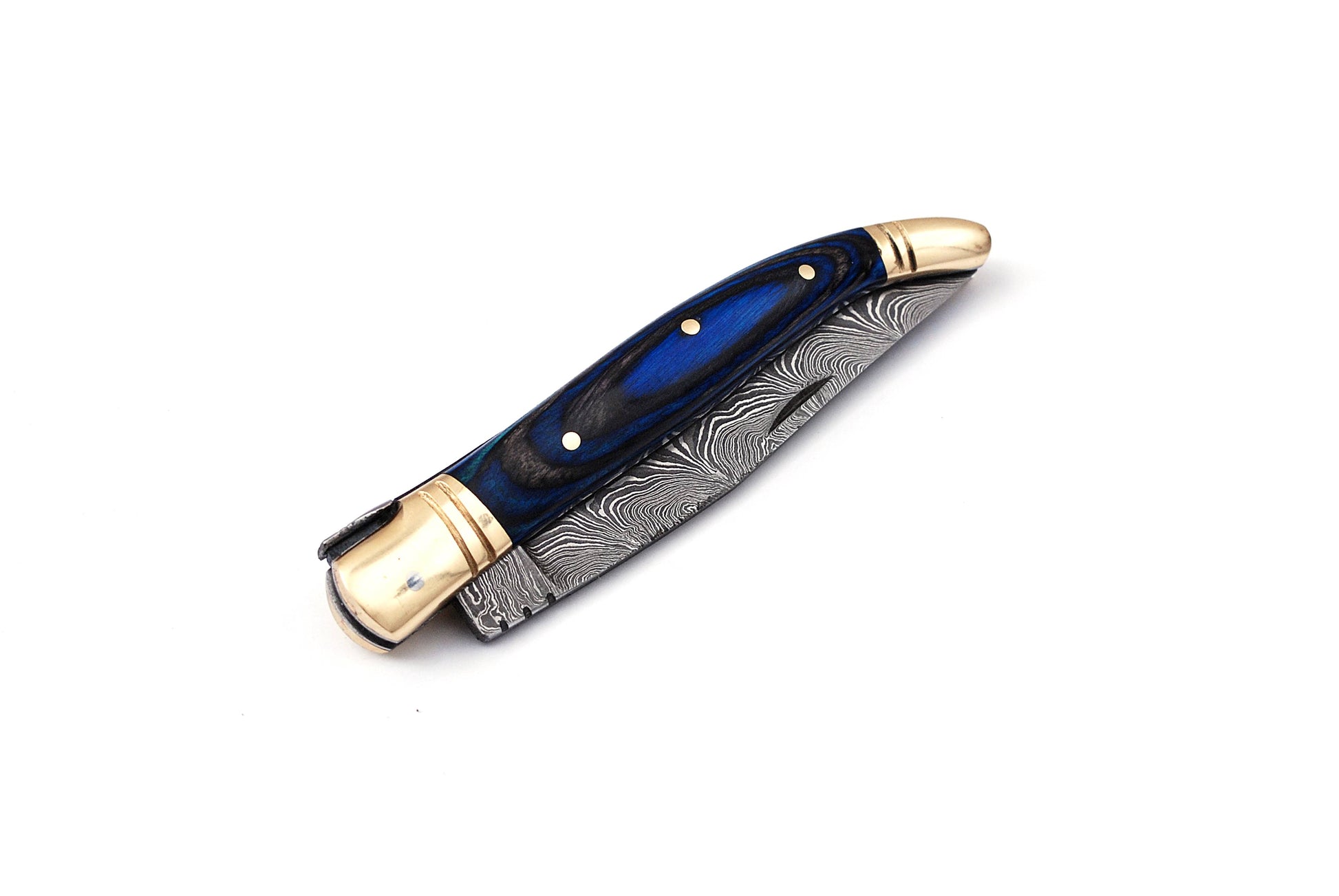 Copy of Laguiole Folding Damascus steel knife, 8.5" Long with 4" hand forged custom twist pattern Blade. 2 tone Blue wood scale with brass bolster, Cow hide leather sheath included