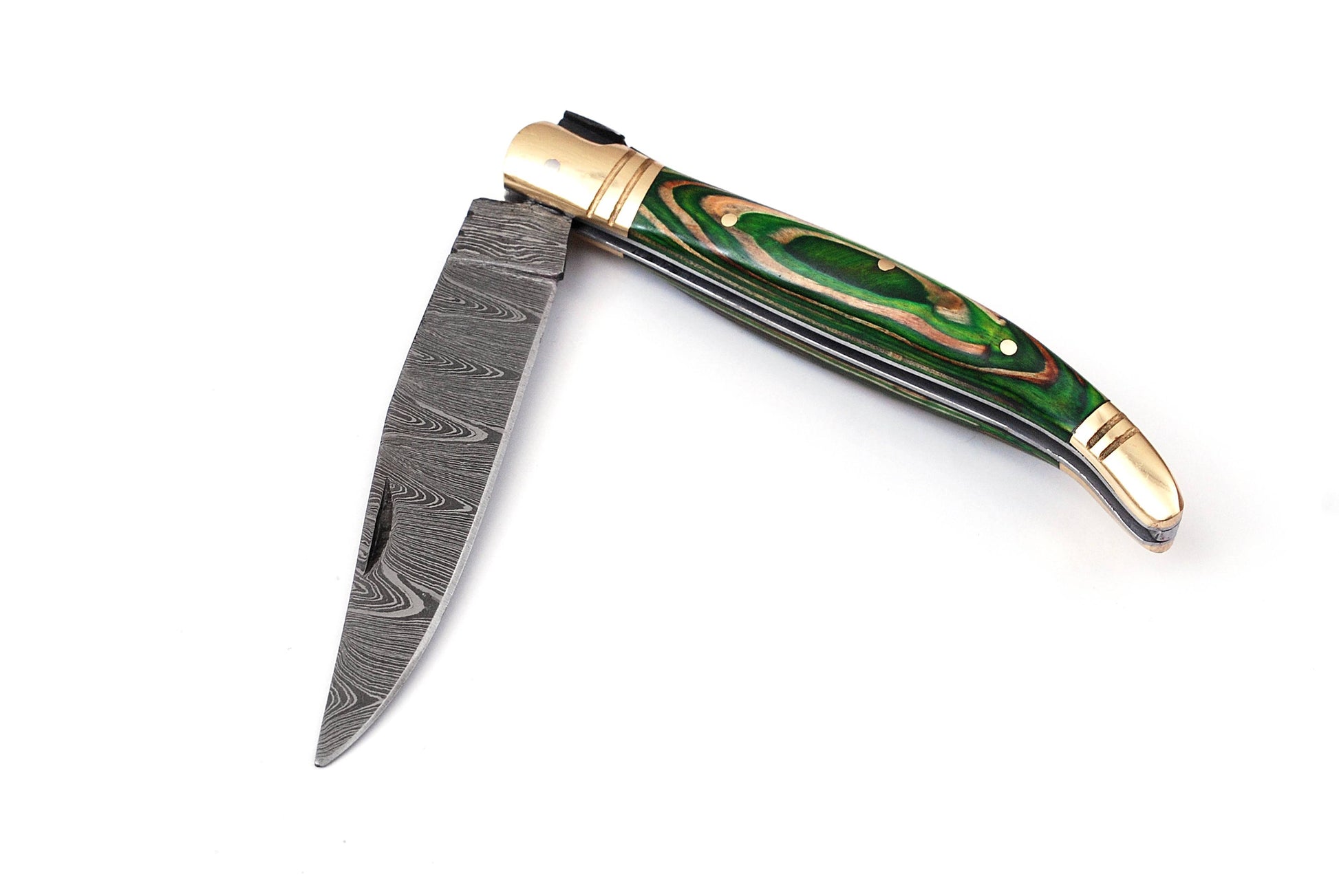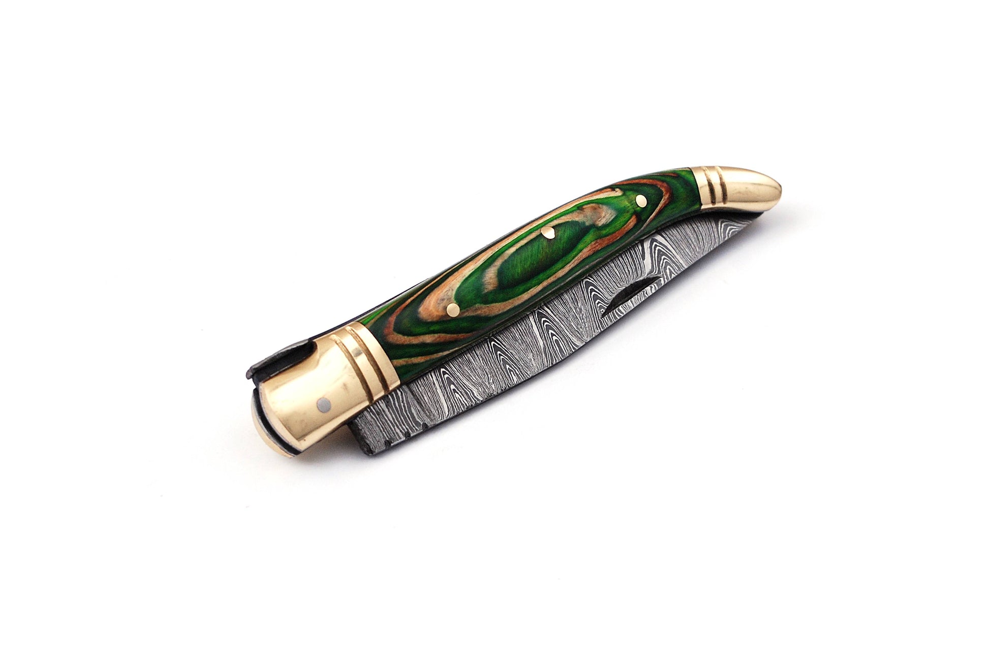 Folding Damascus steel knife, 8.5" Long with 4" hand forged custom twist pattern Blade.2 tone green wood scale with brass bolster, Cow hide leather sheath included