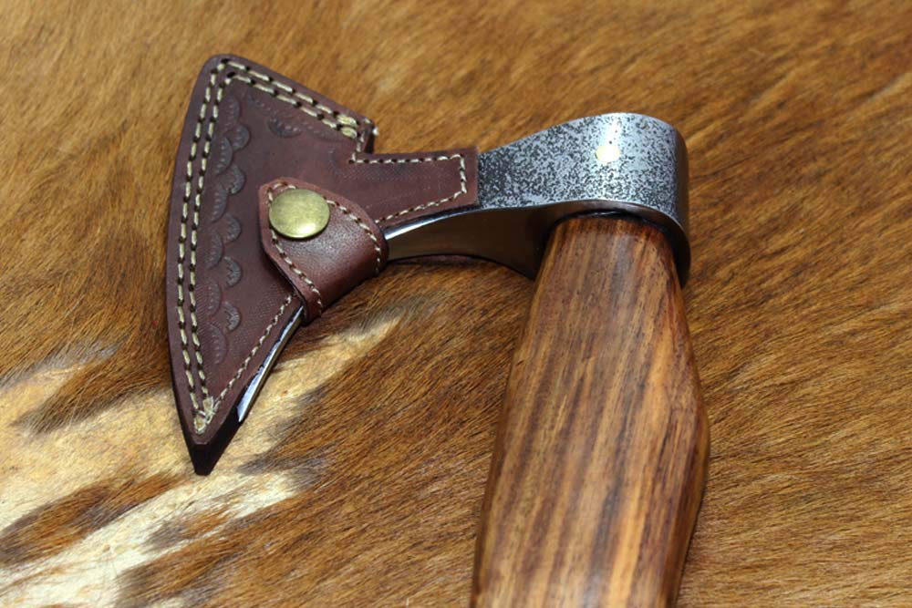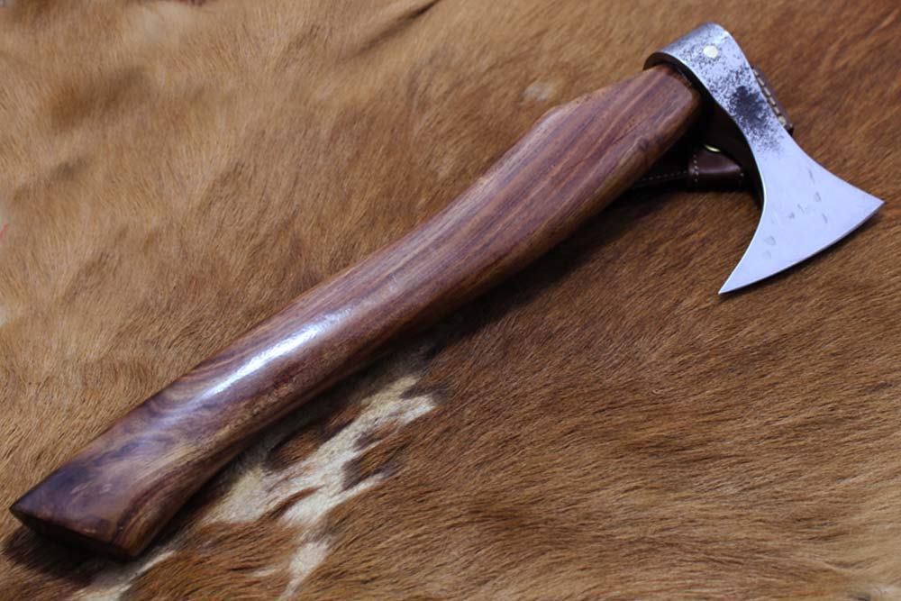 - Tomahawk Axe bearded hiking battle axe 15 Inches long Hand Forged steel with Rose wood round handle, thick cow hide leather sheath