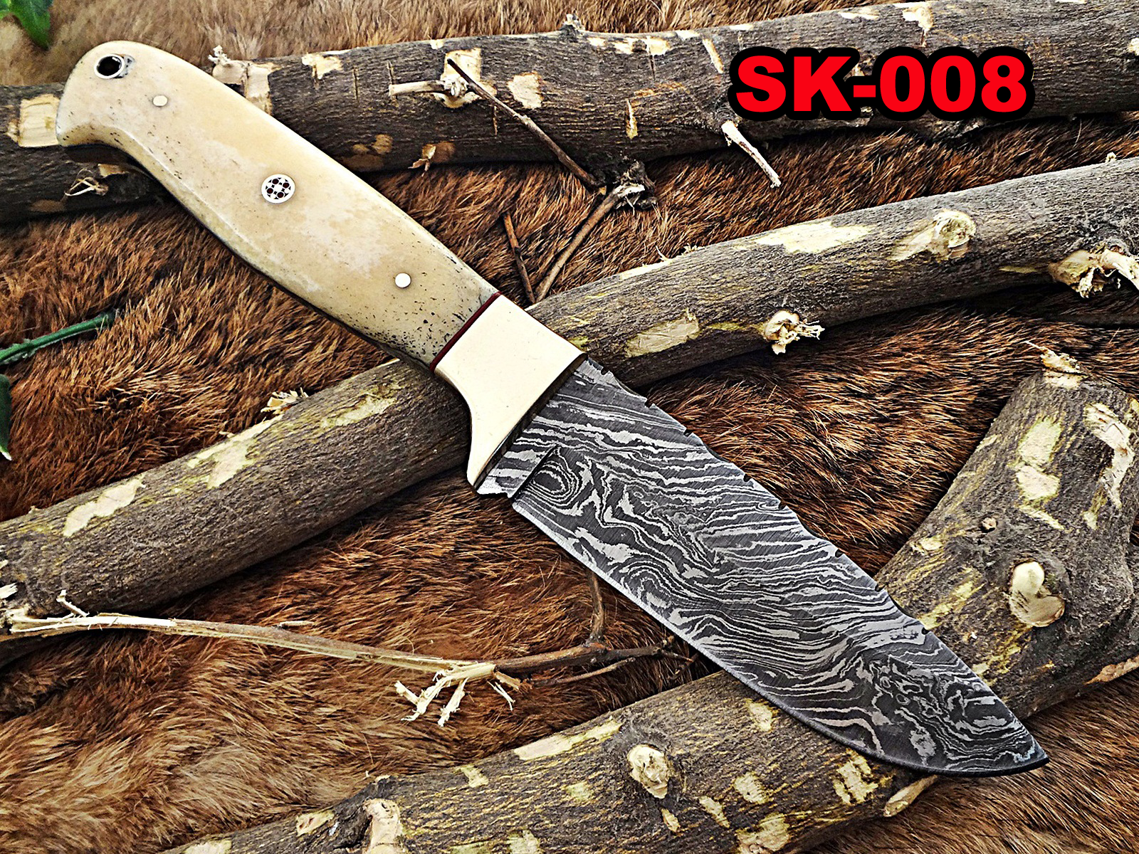 DAMASCUS STEEL 9.5" LONG FULL TANG BLADE SKINING KNIFE, WOOD & BONE, COW SHEATH