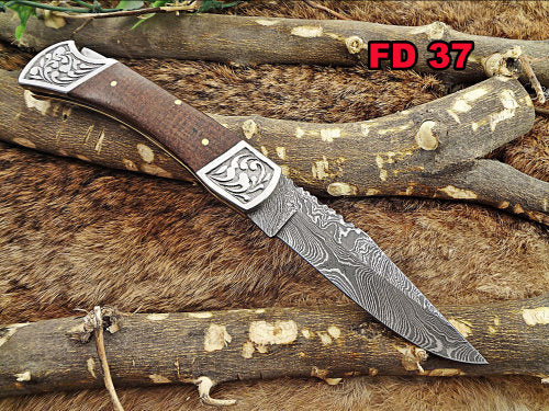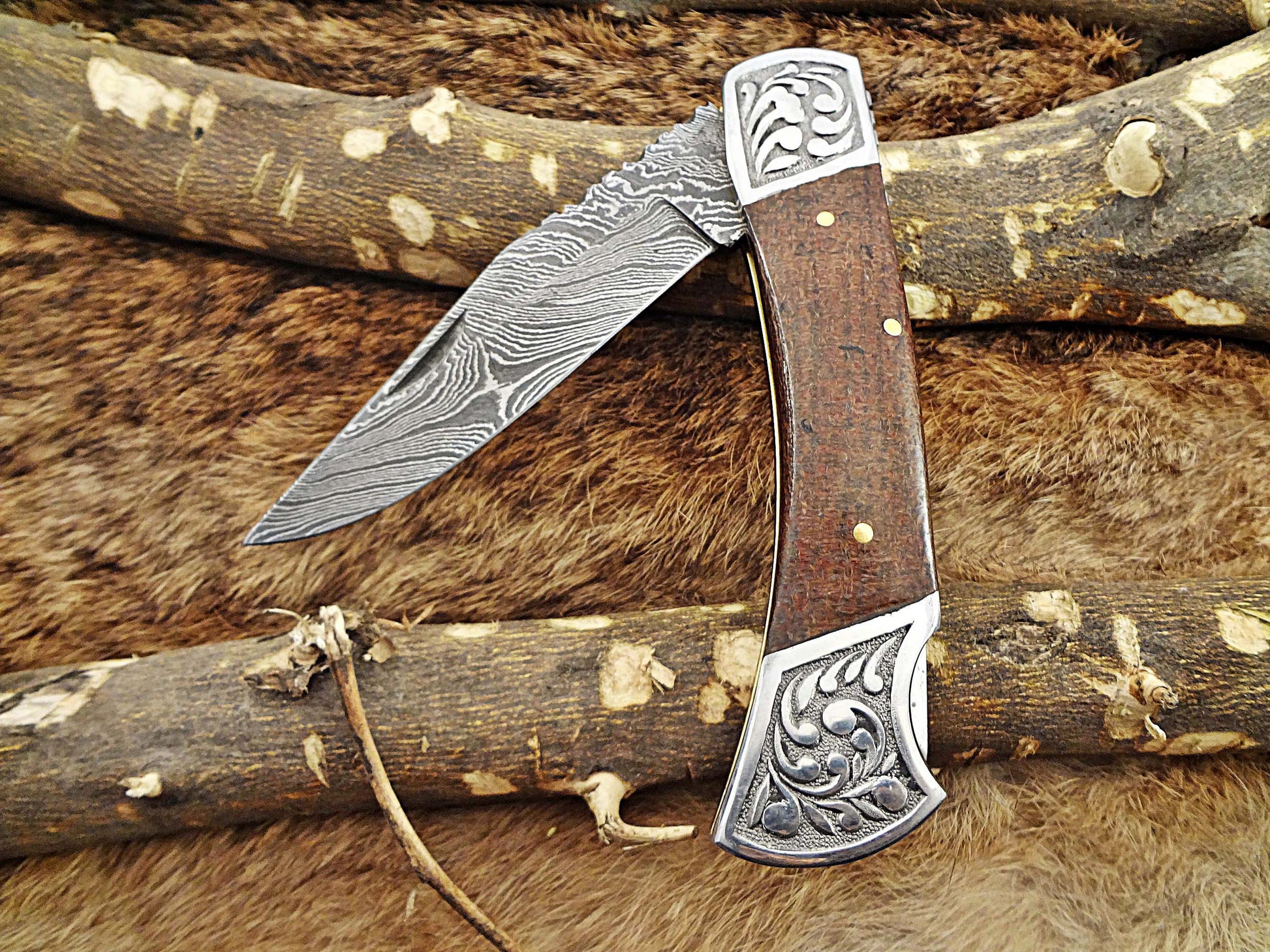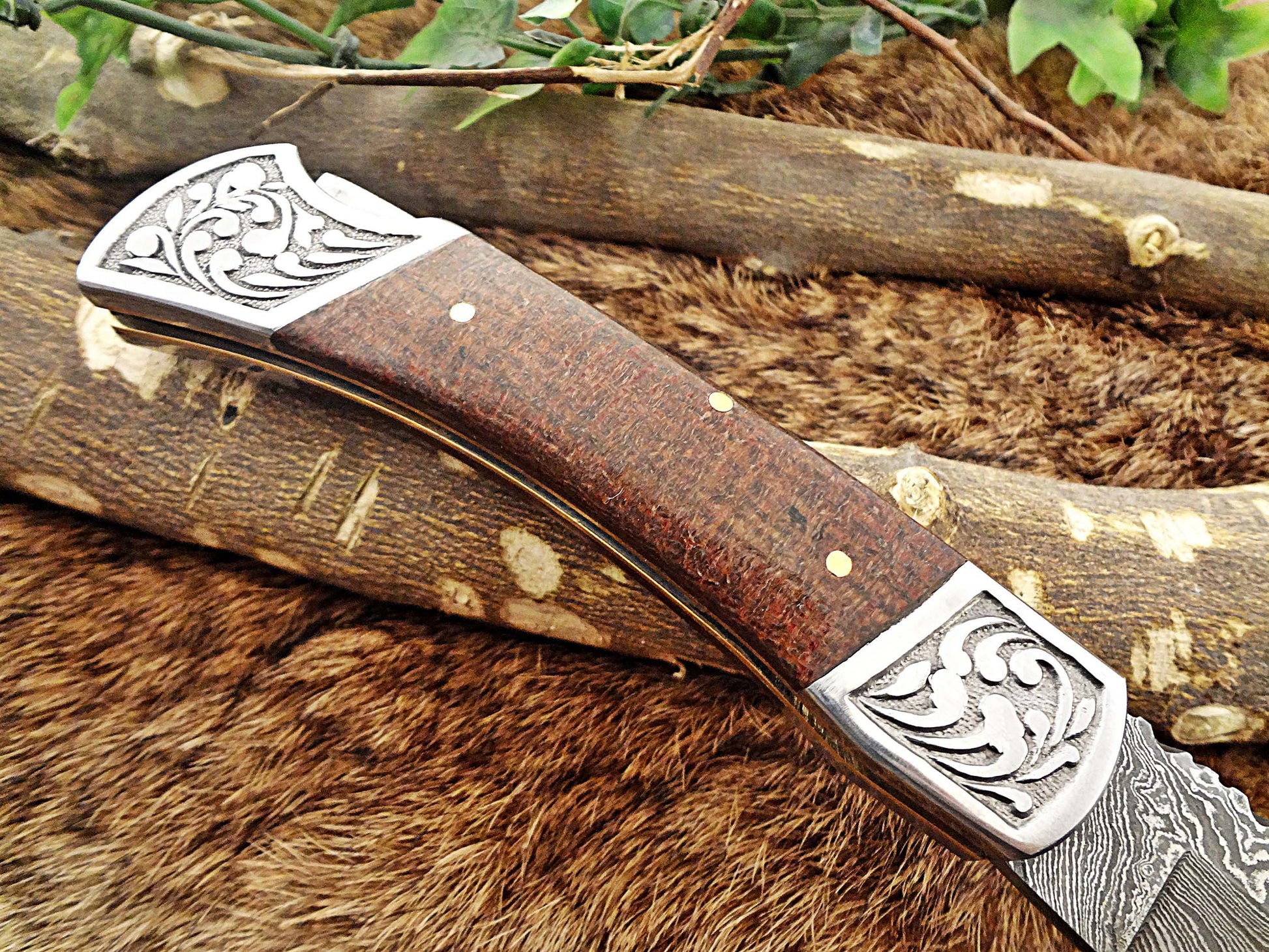 Damascus steel 9" long Folding Knife, Micarta wood Scale with Engraved steel bolster, custom made 4" Hand Forged blade cow leather sheath