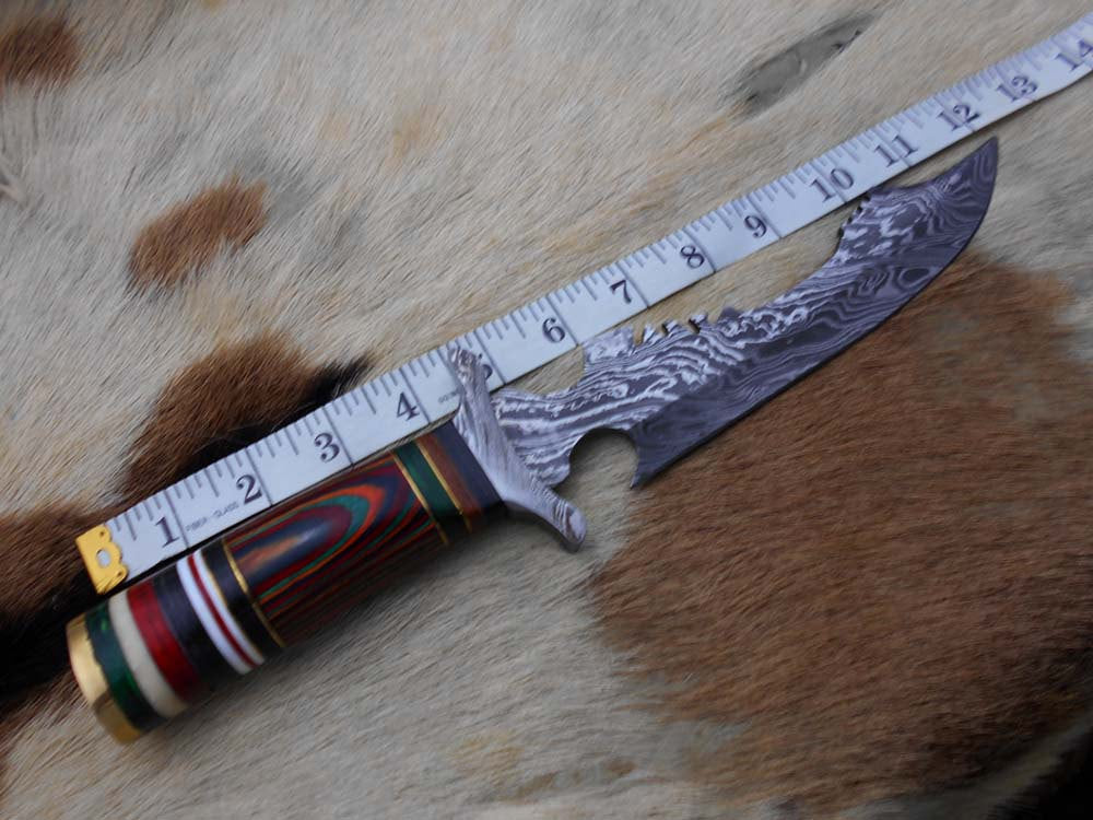 Damascus Steel Dagger Knife with finger guard 12 Inches custom made Hand Forged 7.5" long blade, Colored wood scale, cow hide leather sheath