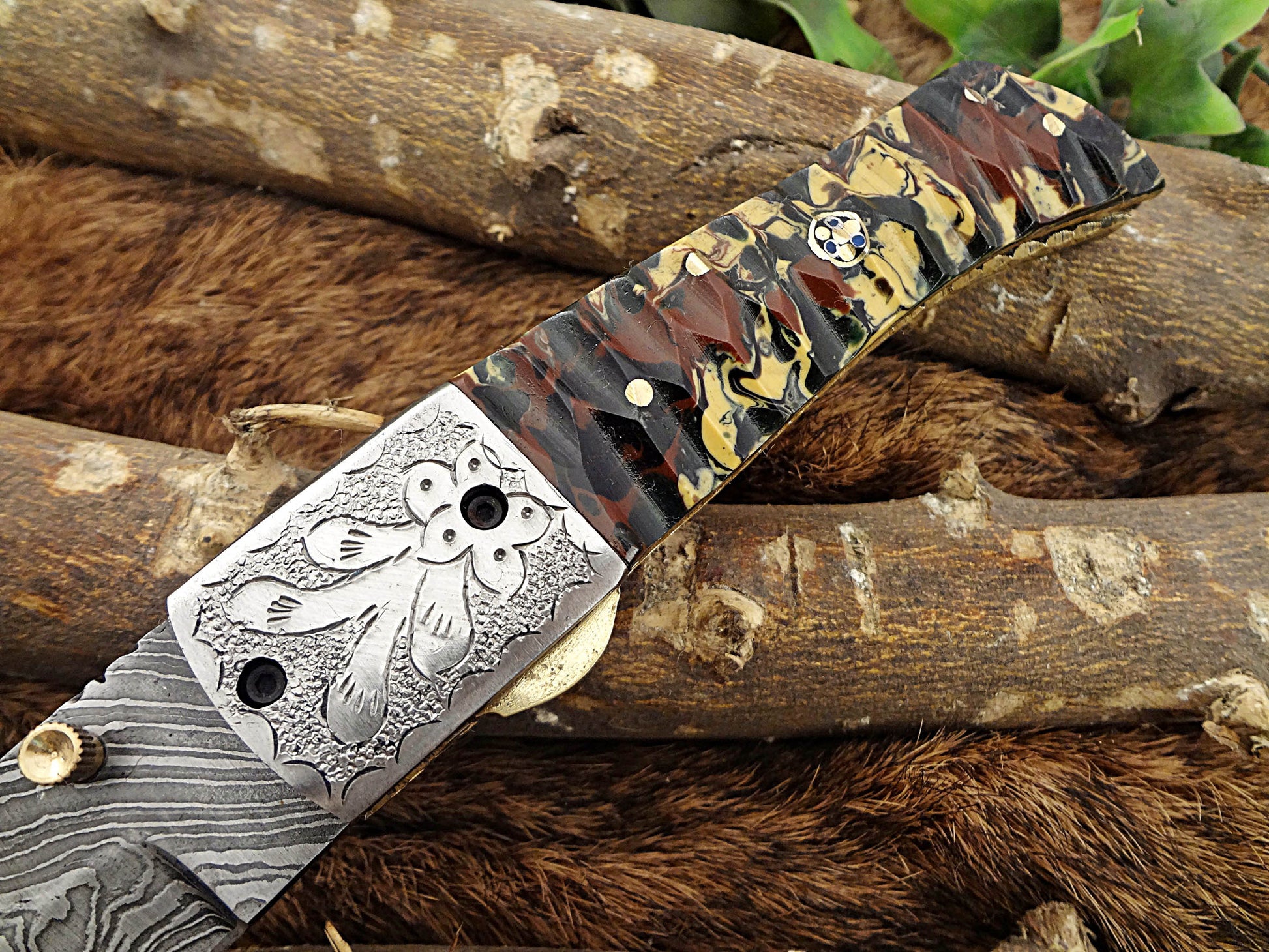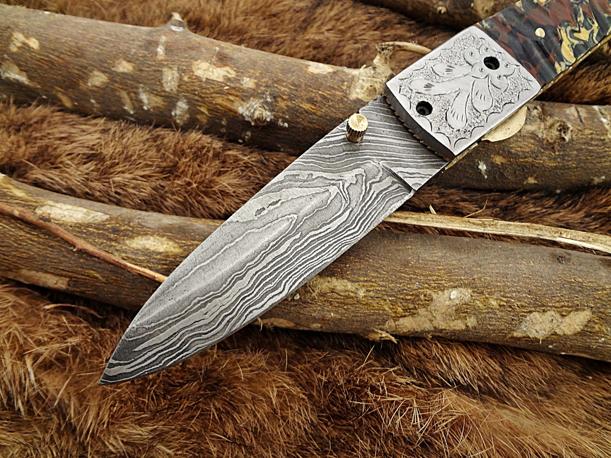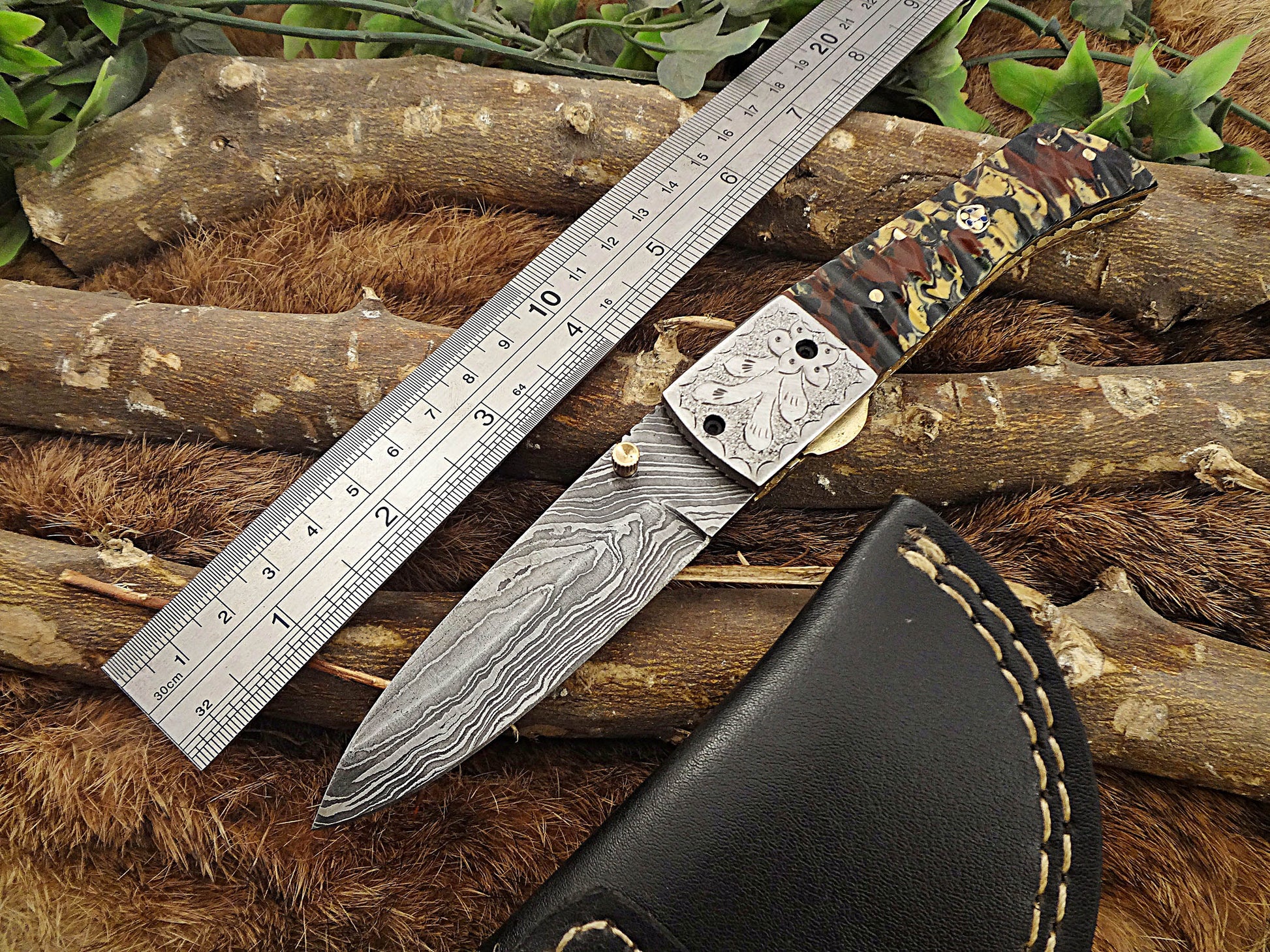 Damascus Steel Folding knife, Exotic Jigged scale in Camouflage & green combo, Engraved plant on steel bolster, Thumb knob & liner lock, Cow Leather sheath