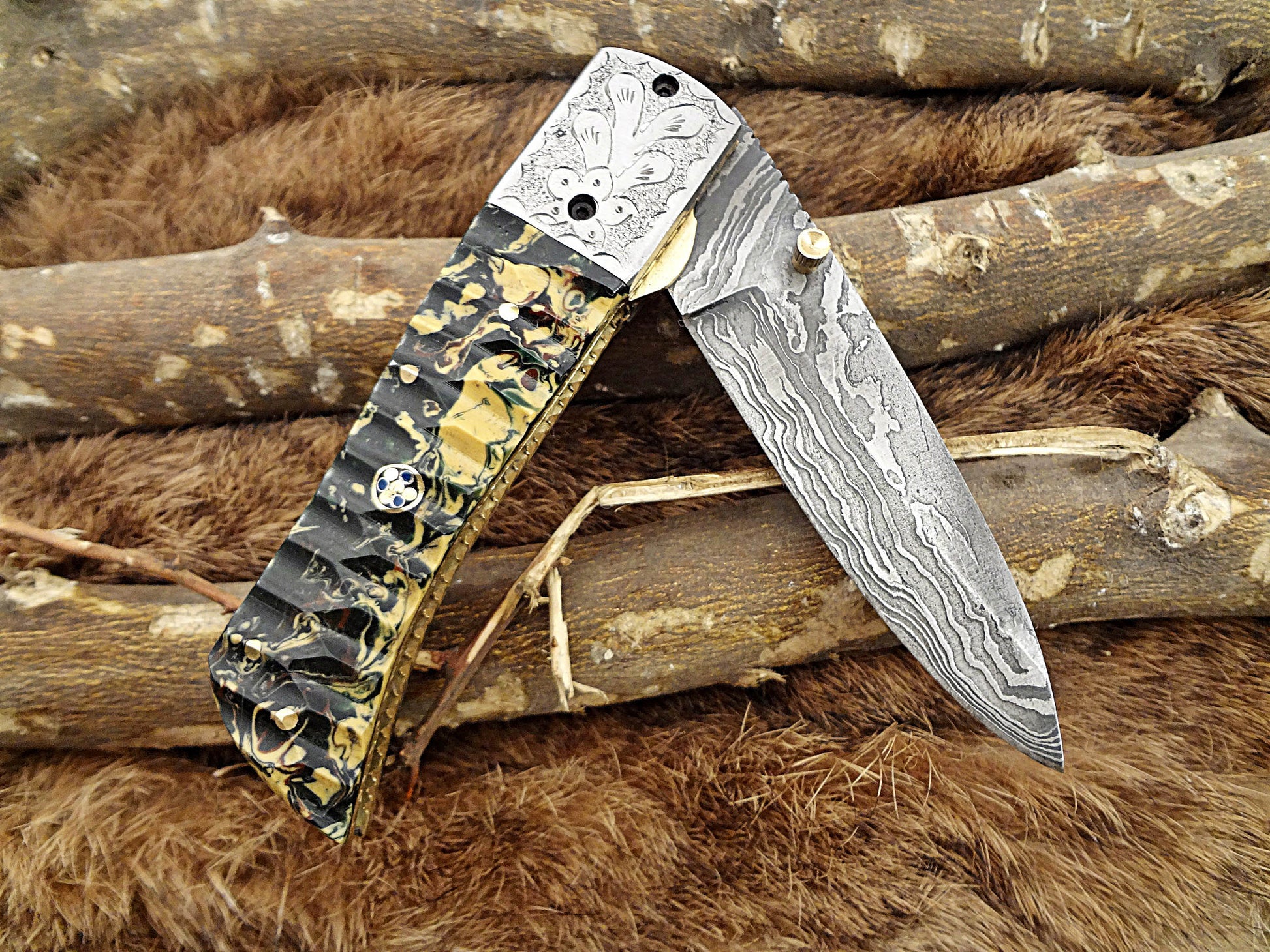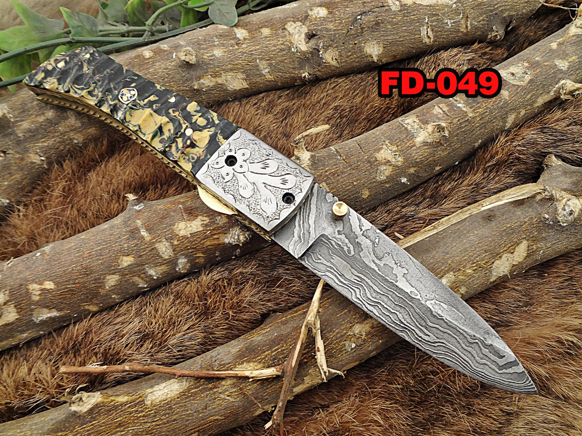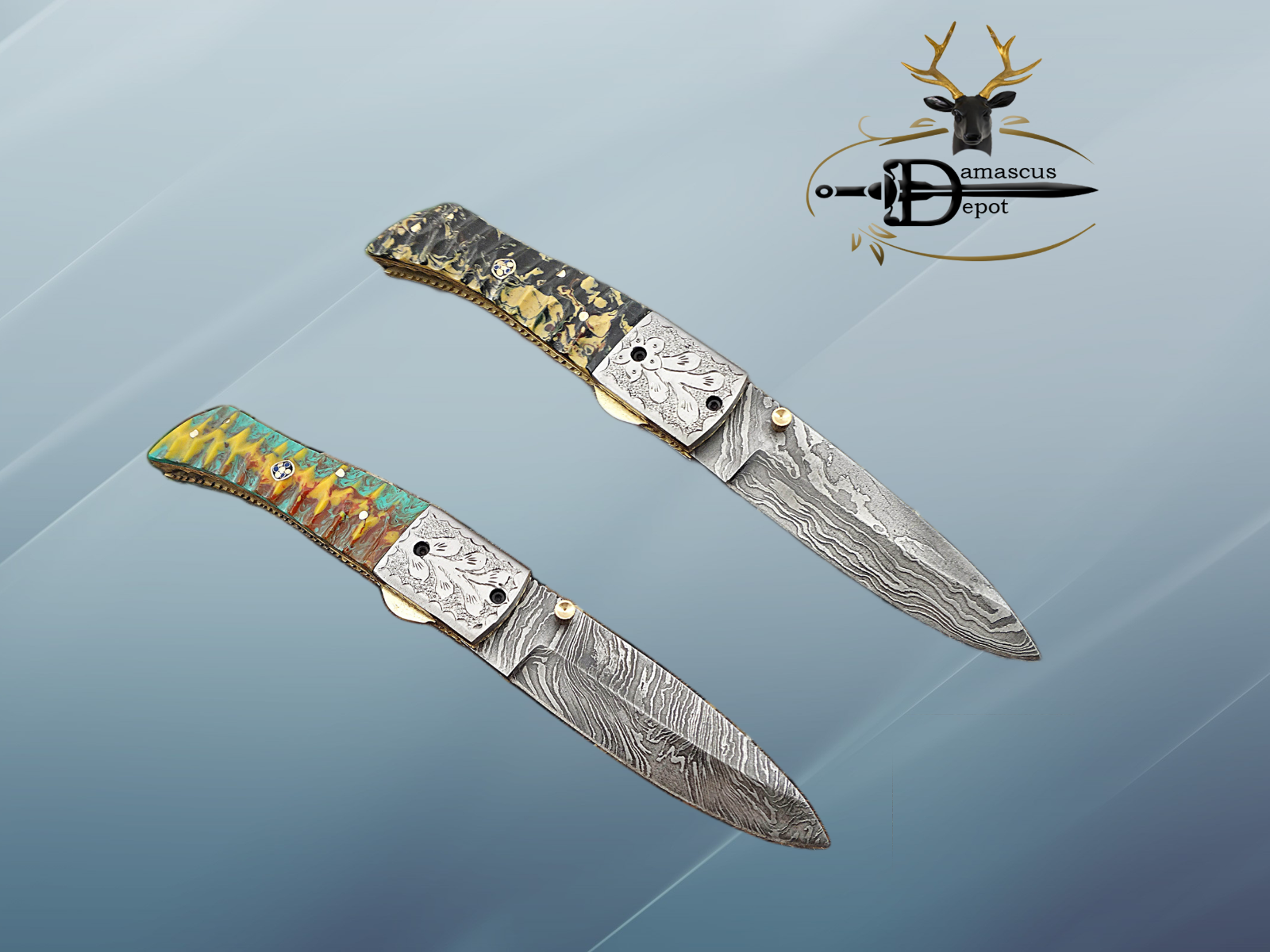 Damascus Steel Folding knife, Exotic Jigged scale in Camouflage & green combo, Engraved plant on steel bolster, Thumb knob & liner lock, Cow Leather sheath