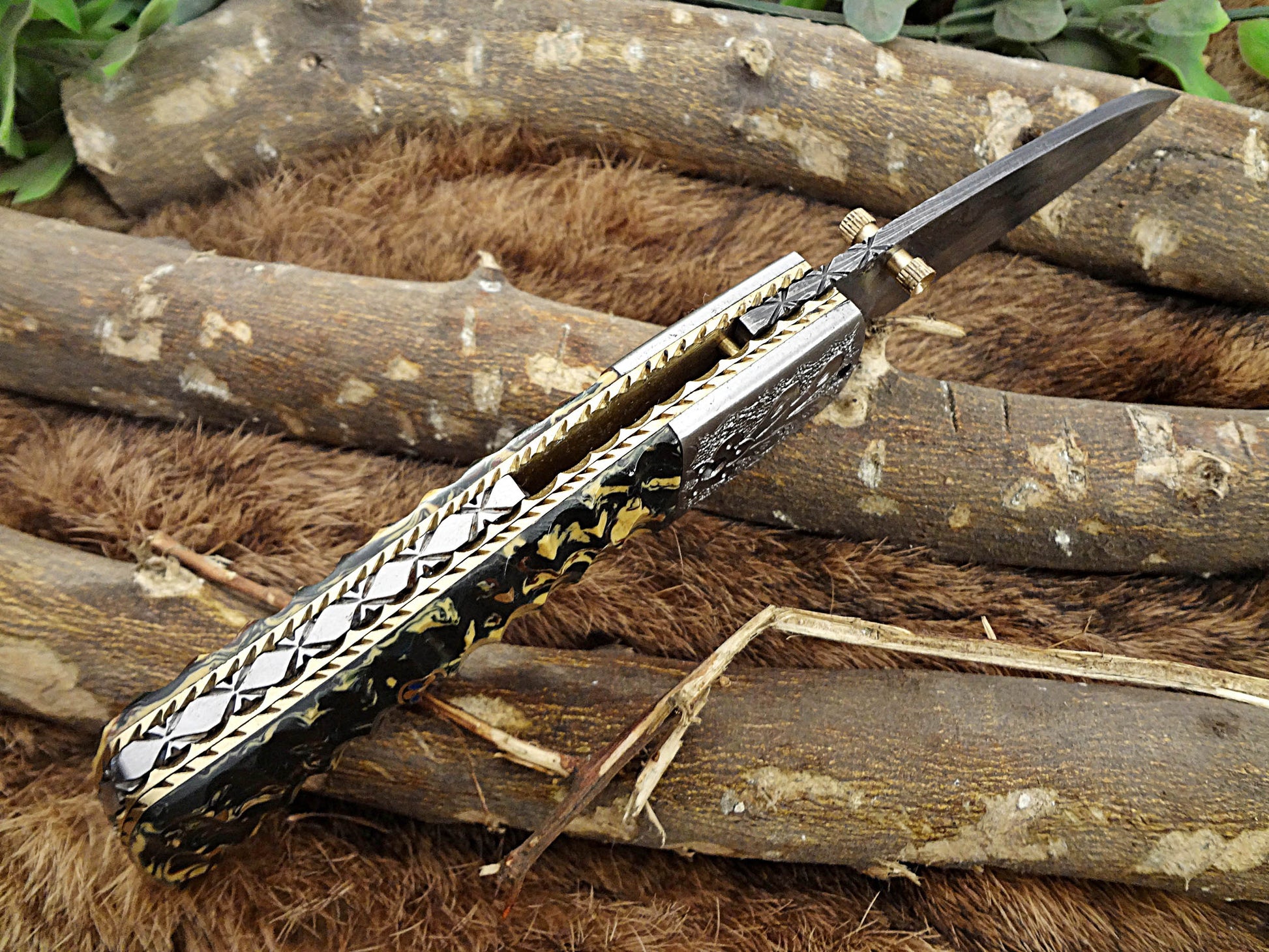 Available in Camouflage and Green multi color Jigged Razen scale & Engraved steel Bolster