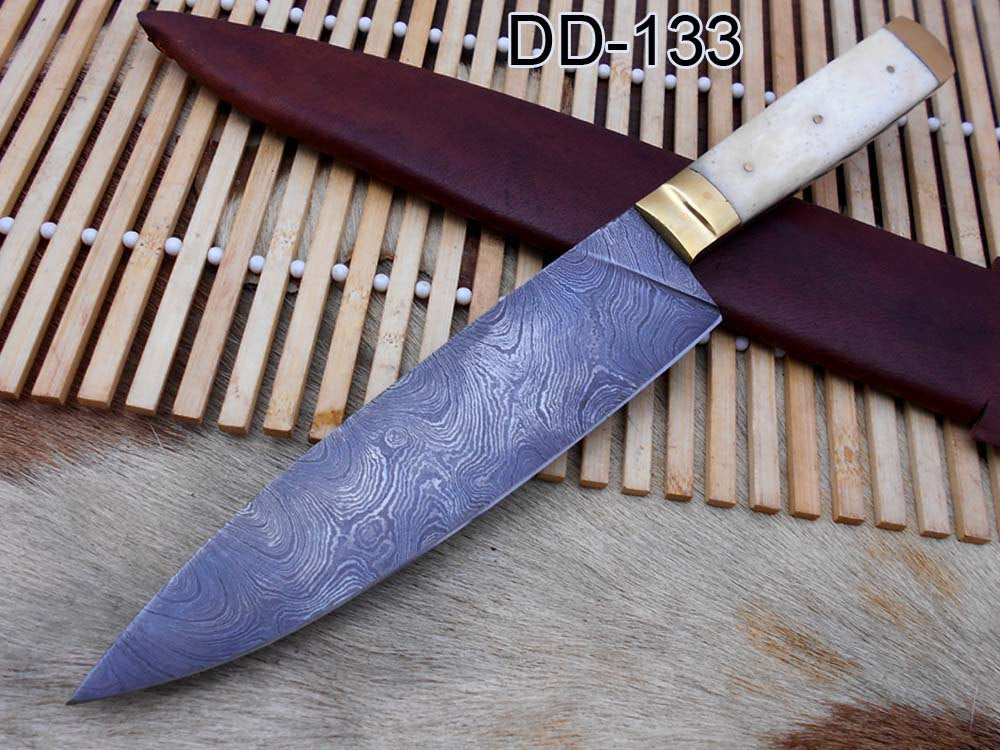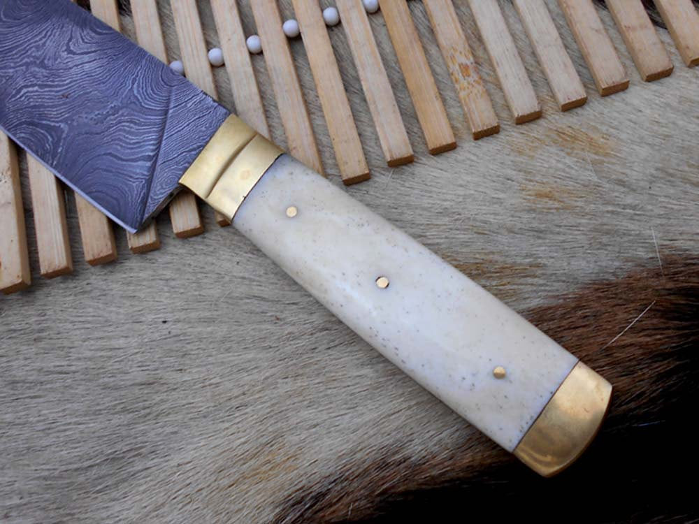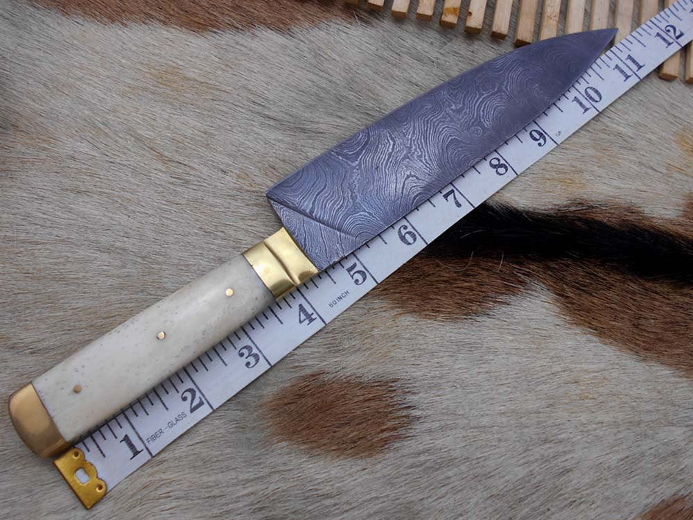 Damascus Steel kitchen Knife 11.4 Inches full tang 7" long Hand Forged blade, Camel bone and brass boldter scale, cow hide leather sheath