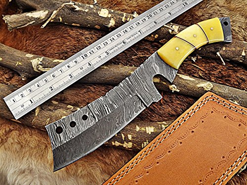 Damascus Steel kitchen Knife Custom made 11 Inches long Hand Forged Damascus steel Cleaver Knife Full Tang Chopper Knife, Butcher Knife Natural Camel Bone Scale, cow leather sheath