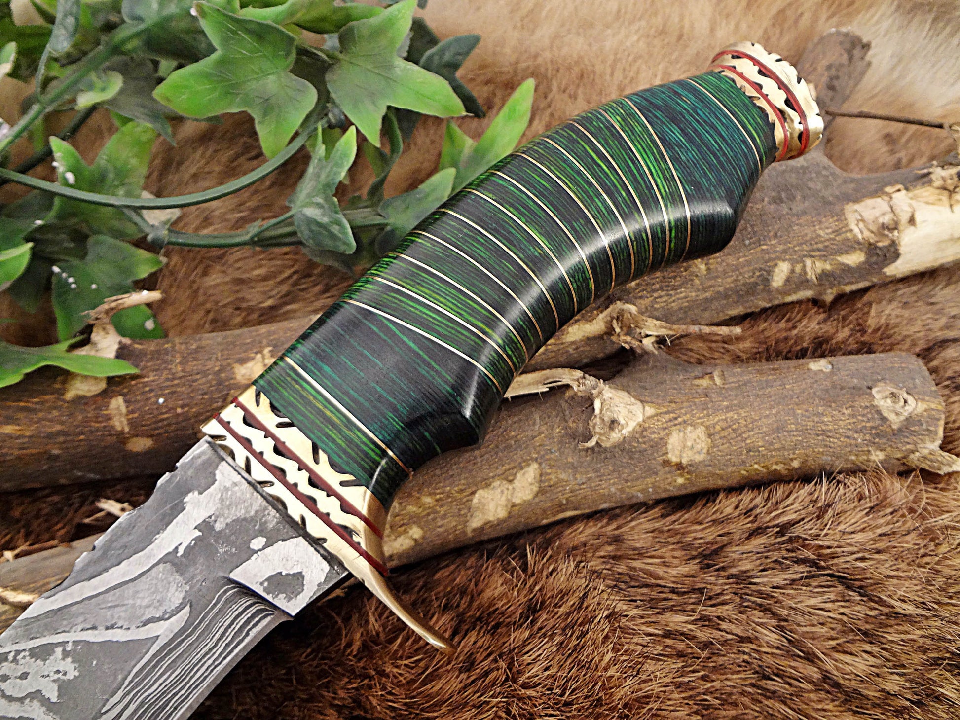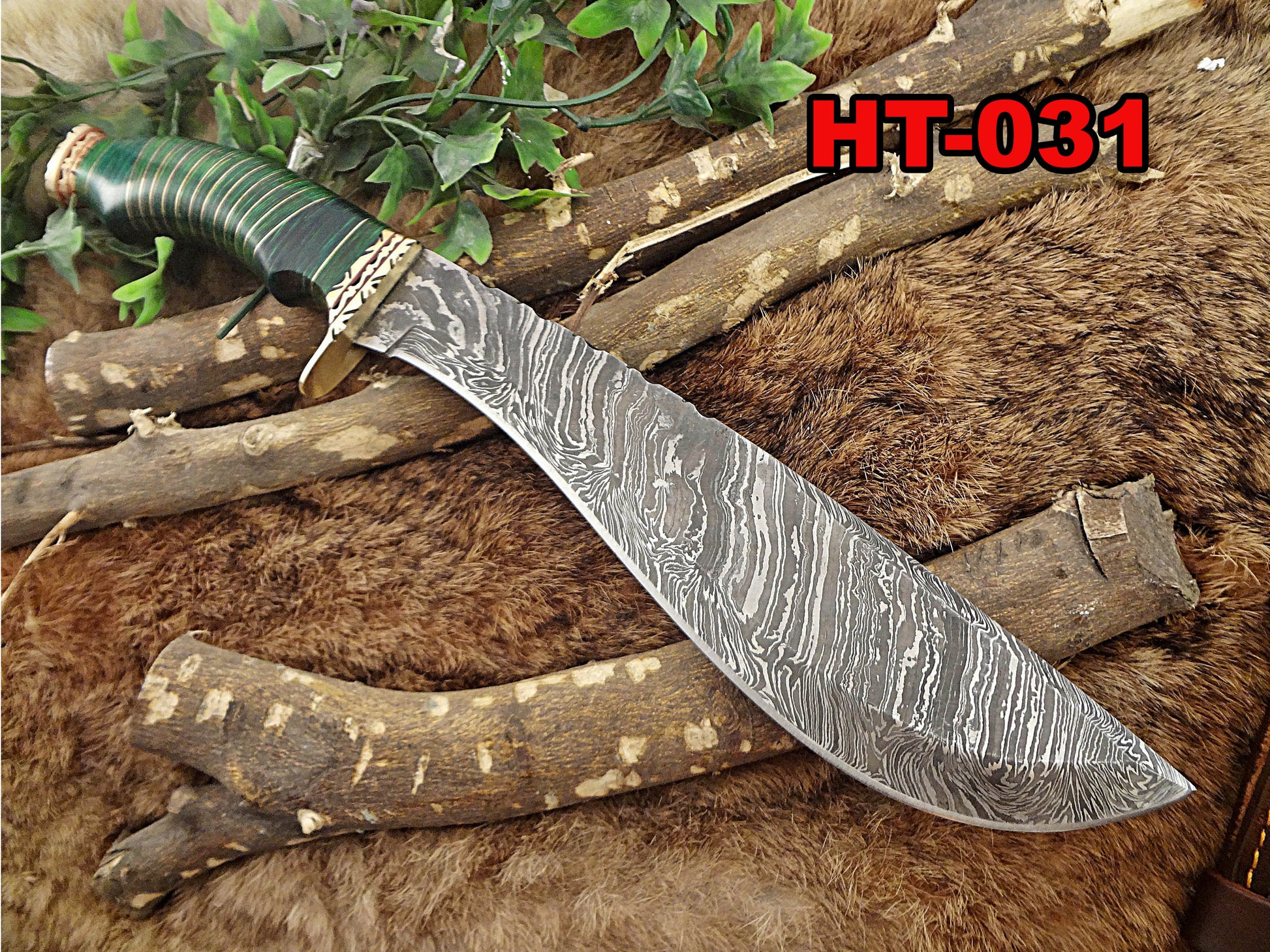 Damascus Steel Kukri Knife 14.5 Inches custom made Hand Forged With 10" blade, 2 Tone Green wood with engraved brass scale, Leather Sheath