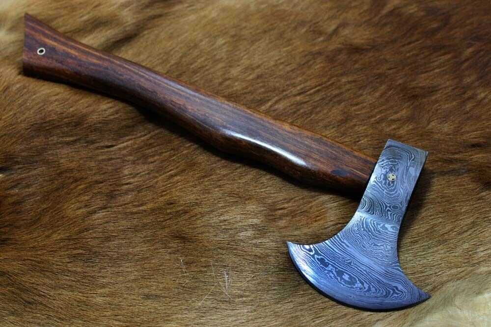 Hand Forged Damascus steel Timmerbila Axe, 15" Long Log Splitter Axewith Rose wood round handle, thick cow hide leather sheath