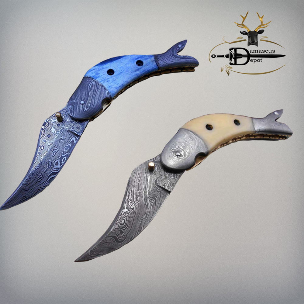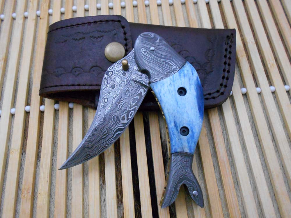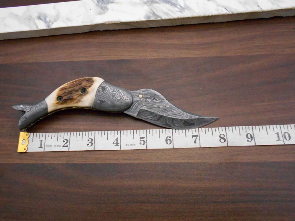Overall 8″ Long Fish shape Folding knife with 3.5″ long Damascus cutting edge