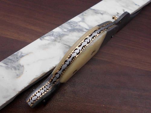 Available in Stag Antler, Blue Colored and natural camel bone scale with Damascus bolster on both edges