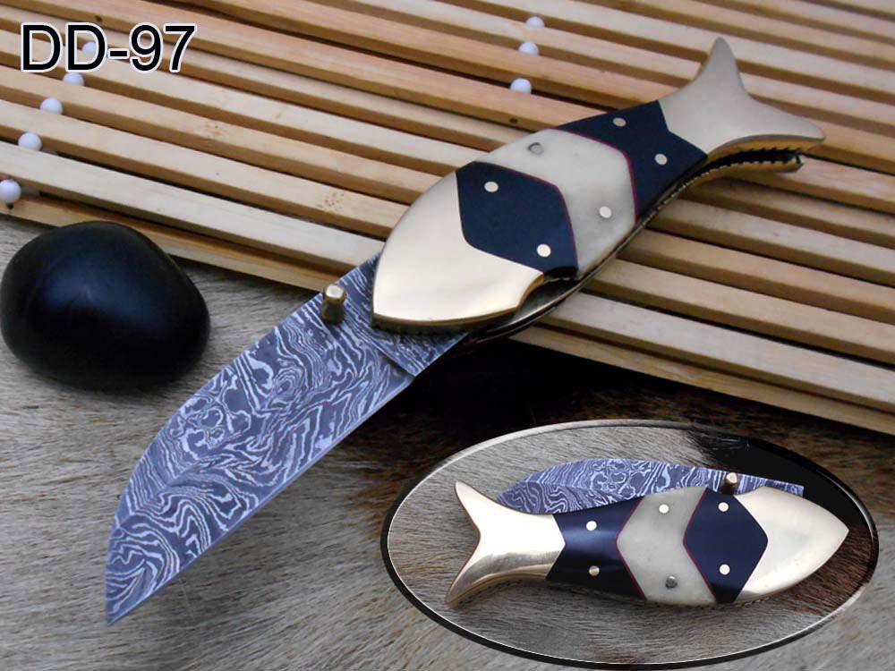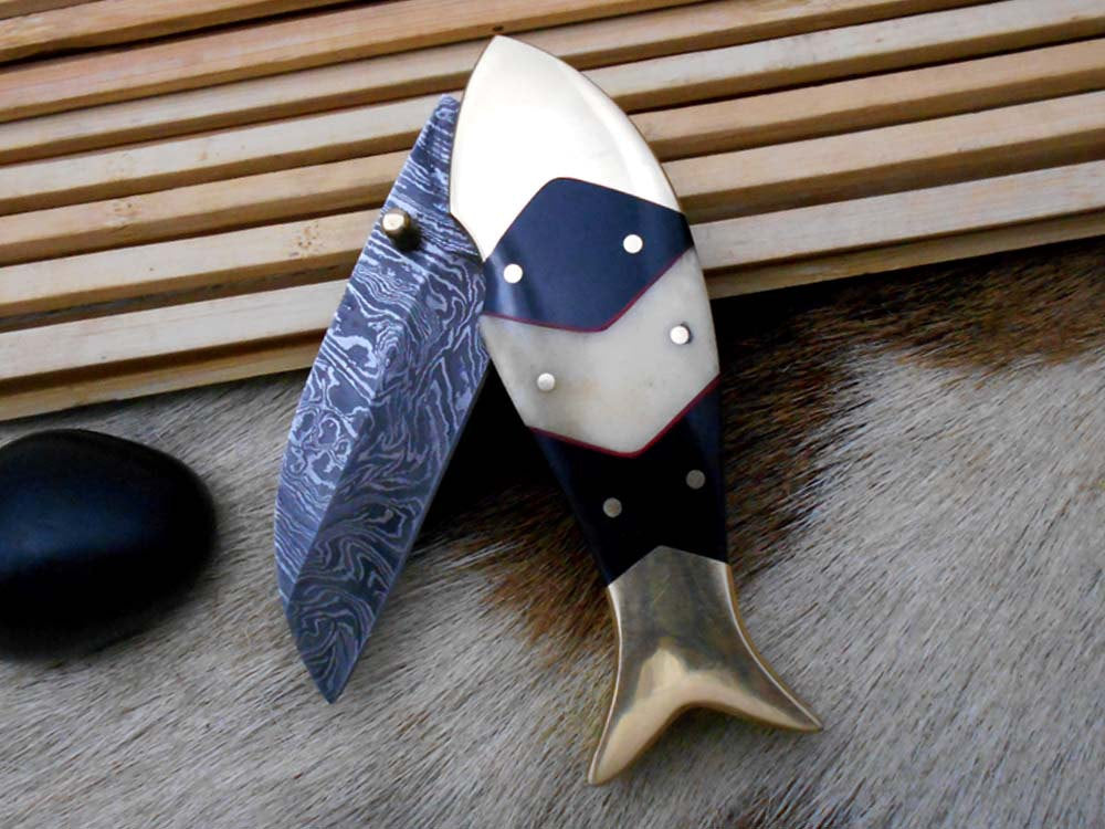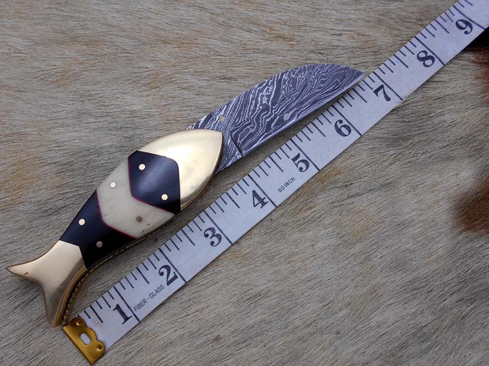Fish style Damascus steel folding pocket knife hand forged custom twisted 6.8" compact W/Camel Bone & brass exotic scale, leather sheath