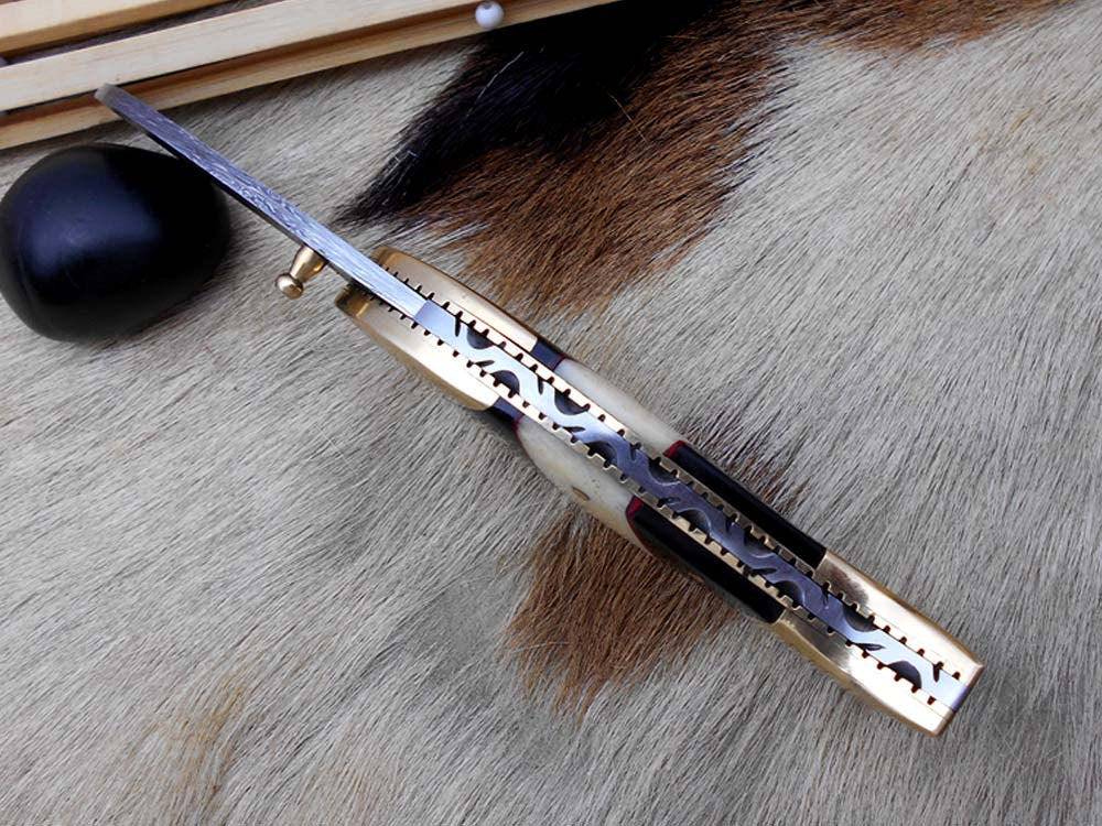 Exotic camel bone, wood scale with Brass bolster on both edges