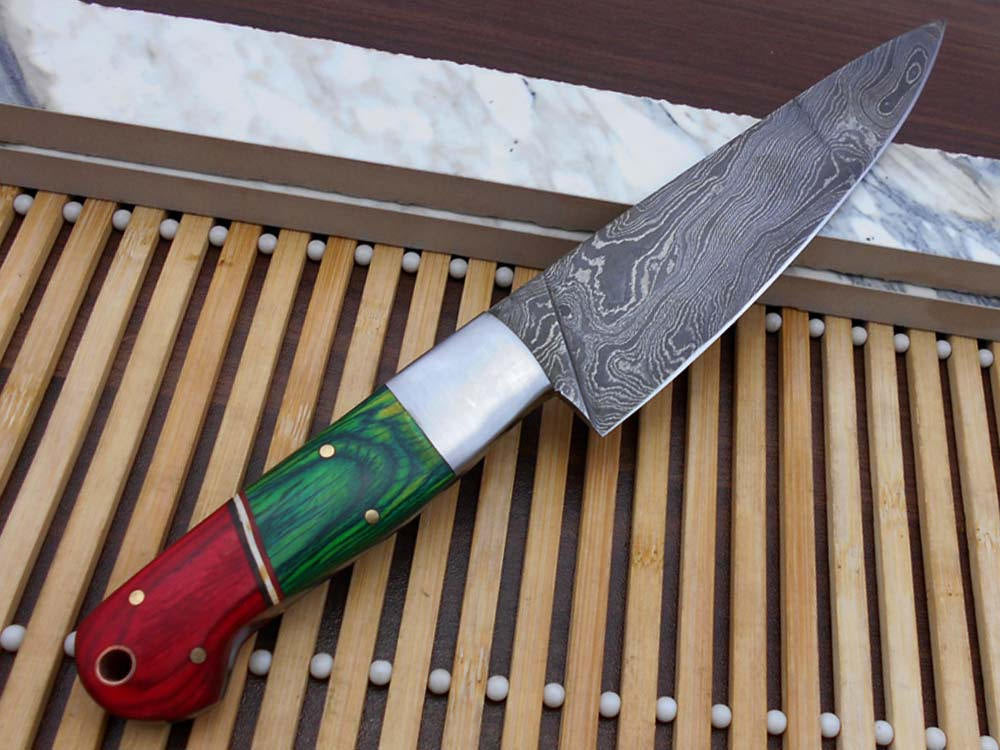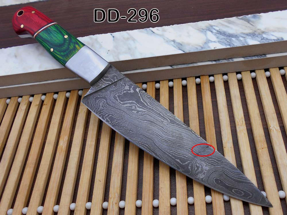 Red & green wood scale with steel bolster 10 Inches long custom made Damascus steel full tang 6" blade Chef Knife , cow leather sheath