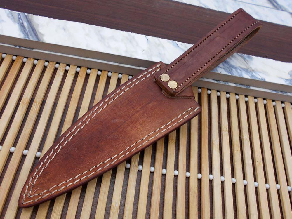 Never store your knife for long time in leather sheath. Leather can absorb water which will rust the knife. Always clean the blade after using and apply oil or wax (please use cooking oil on Chef Knife) before you store it, for its longer life and durability.